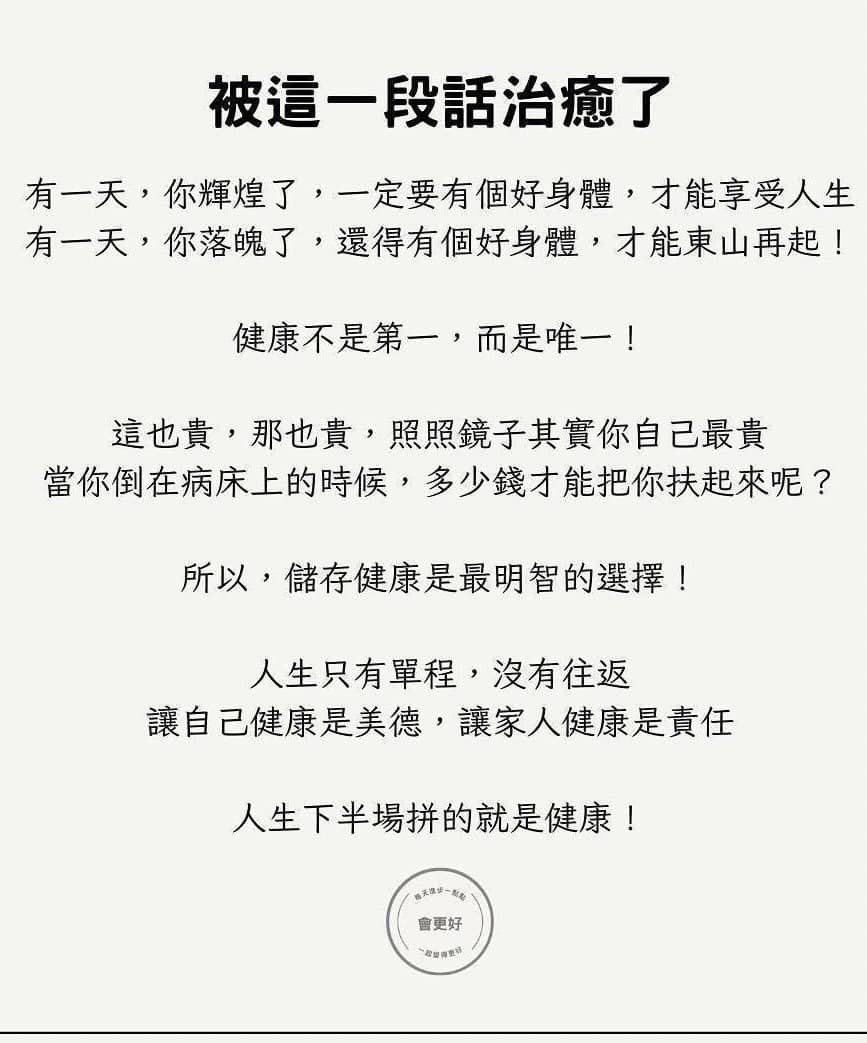 希望能藉由自己的經驗與分享,能幫助到更多有亞健康問題的家庭、朋友及家人們,得到健康!
