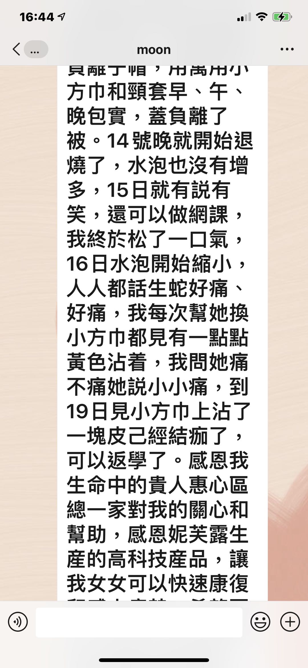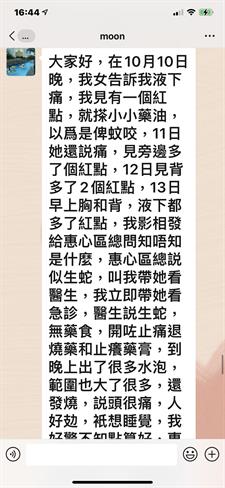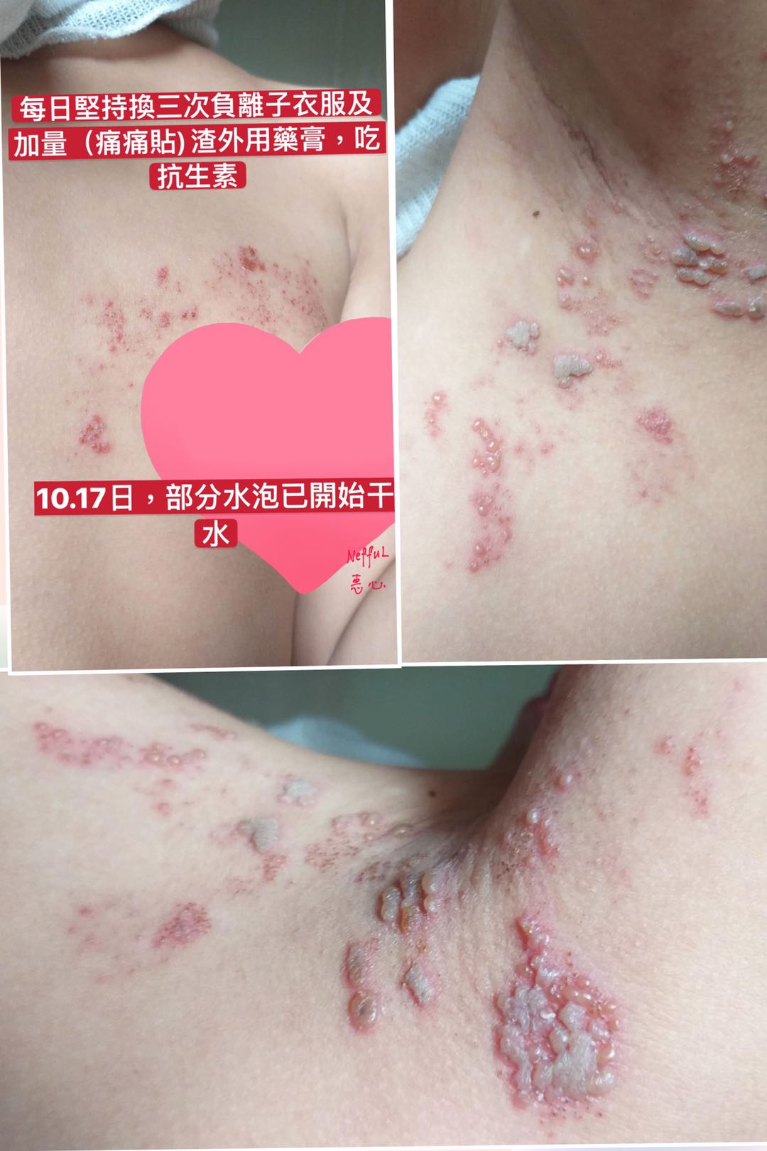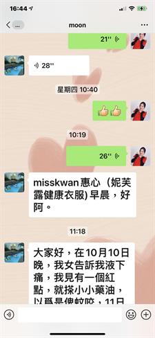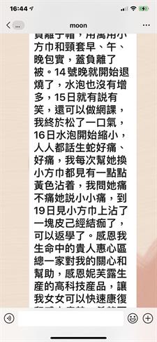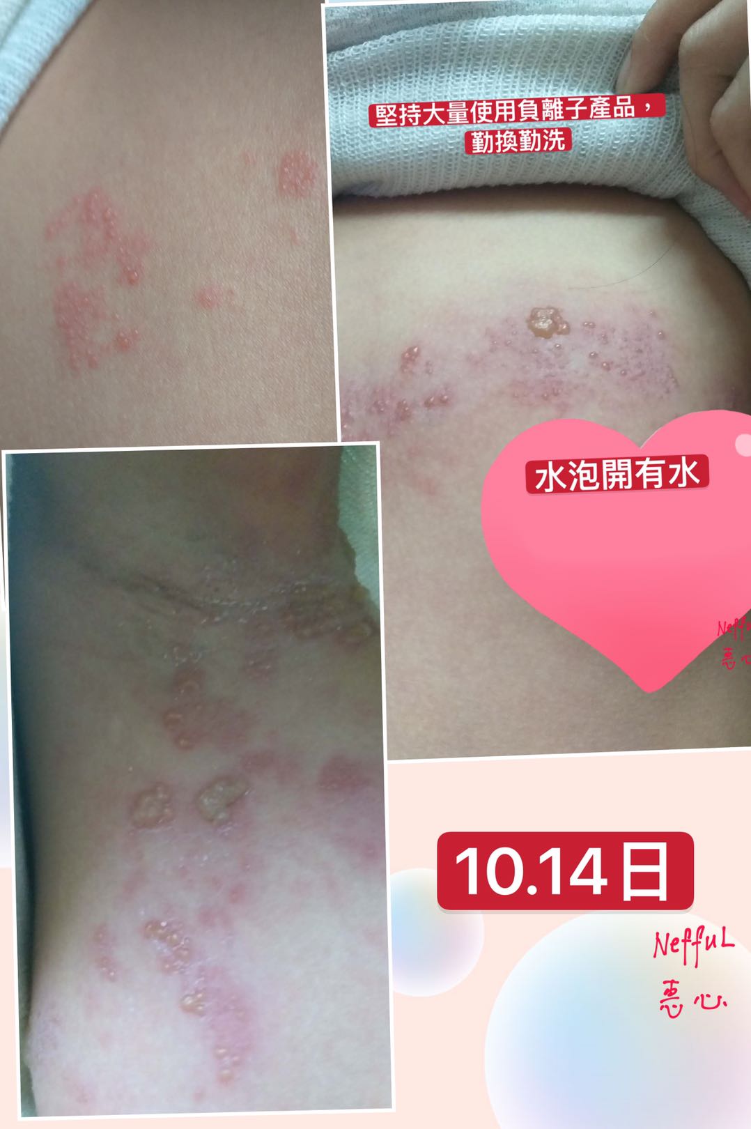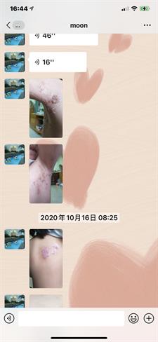 大家好,在10月10日晚,我女告訴我液下痛,我見有一個紅點,就搽小小藥油,以爲是俾蚊咬,11日她還説痛,見旁邊多了個紅點,12日見背多了2個紅點,13日早上胸和背,液下都多了紅點,我影相發給惠心區總問知唔知是什麼,惠心區總説似生蛇,叫我帶她看醫生,我立即帶她看急診,醫生説生蛇,無藥食,開咗止痛退燒藥和止癢藥膏,到晚上出了很多水泡,範圍也大了很多,還發燒,説頭很痛,人好攰,衹想睡覺,我好驚不知點算好,惠心區總叫我用多些負離子包住,我給她戴負離子帽,用萬用小方巾和頸套早、午、晚包實,蓋負離了被。14號晚就開始退燒了,水泡也沒有增多,15日就有説有笑,還可以做網課,我終於松了一口氣,16日水泡開始縮小,人人都話生蛇好痛、好痛,我每次幫她換小方巾都見有一點點黃色沾着,我問她痛不痛她説小小痛,到19日見小方巾上沾了一塊皮己經結痂了,可以返學了。感恩我生命中的貴人惠心區總一家對我的關心和幫助,感恩妮芙露生産的高科技産品,讓我女女可以快速康復和感小痛楚,希望更多人能用上産品爲我們的健康保駕護航。