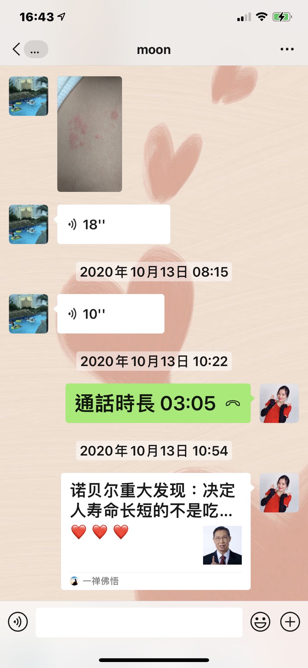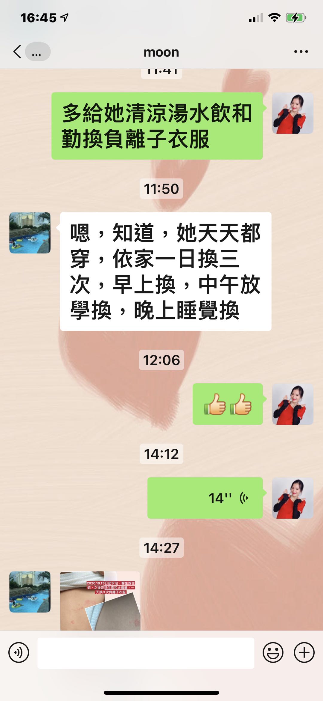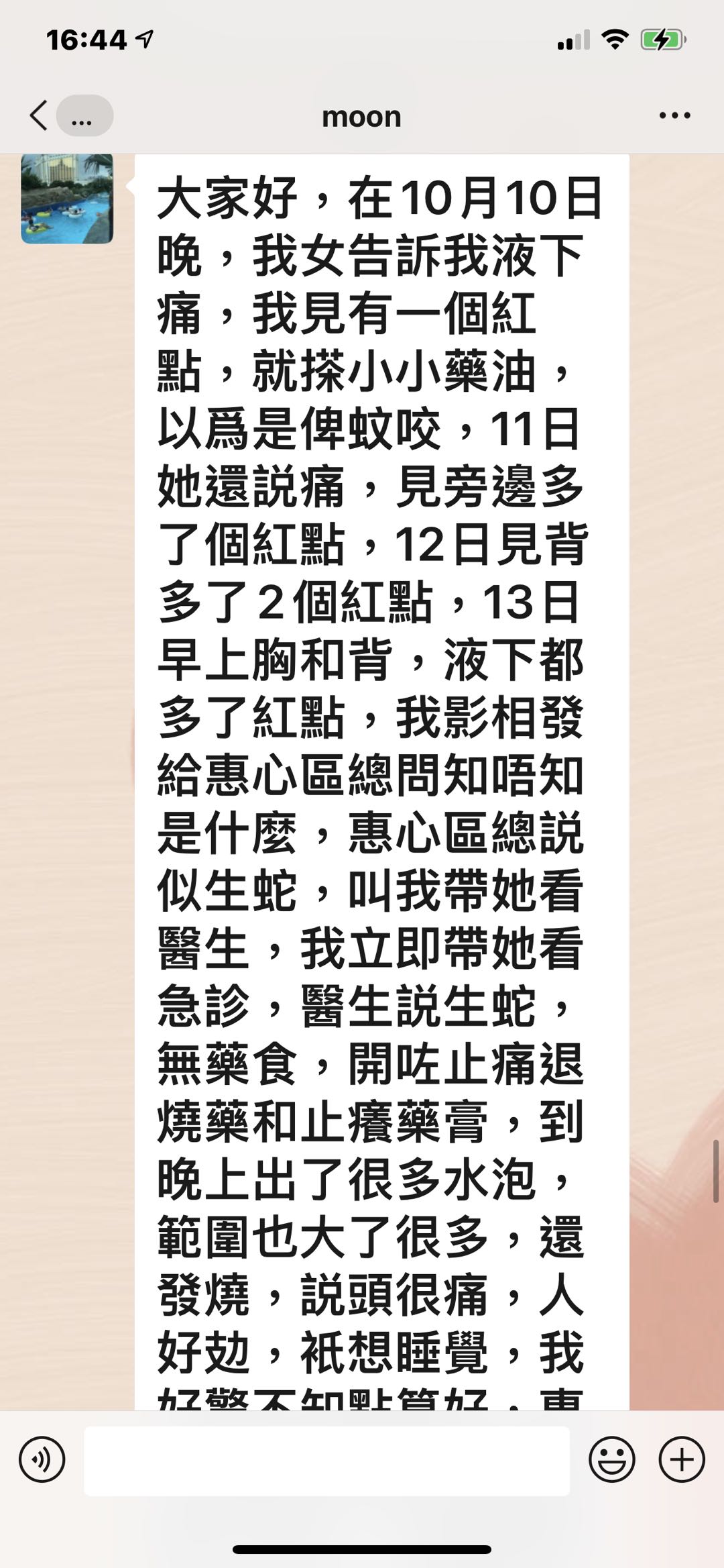 大家好,在10月10日晚,我女告訴我液下痛,我見有一個紅點,就搽小小藥油,以爲是俾蚊咬,11日她還説痛,見旁邊多了個紅點,12日見背多了2個紅點,13日早上胸和背,液下都多了紅點,我影相發給惠心區總問知唔知是什麼,惠心區總説似生蛇,叫我帶她看醫生,我立即帶她看急診,醫生説生蛇,無藥食,開咗止痛退燒藥和止癢藥膏,到晚上出了很多水泡,範圍也大了很多,還發燒,説頭很痛,人好攰,衹想睡覺,我好驚不知點算好,惠心區總叫我用多些負離子包住,我給她戴負離子帽,用萬用小方巾和頸套早、午、晚包實,蓋負離了被。14號晚就開始退燒了,水泡也沒有增多,15日就有説有笑,還可以做網課,我終於松了一口氣,16日水泡開始縮小,人人都話生蛇好痛、好痛,我每次幫她換小方巾都見有一點點黃色沾着,我問她痛不痛她説小小痛,到19日見小方巾上沾了一塊皮己經結痂了,可以返學了。感恩我生命中的貴人惠心區總一家對我的關心和幫助,感恩妮芙露生産的高科技産品,讓我女女可以快速康復和感小痛楚,希望更多人能用上産品爲我們的健康保駕護航。