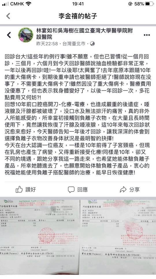 今天在台大認識一位癌友,一樣是10年前得了子宮頸癌,但現在乳房也產生了病變,又得重新接受化療!同樣是10年,卻又不同的境遇,跟她分享我這一路走來,也希望她能体驗負離子產品,所幸她聽進去了,也願意開始体驗負離子產品,衷心的祝福她能使用負離子搭配醫師的治療,能早日恢復健康!