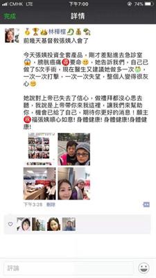 好消息分享在今年四月份,醫生說,她沒有癌症細胞,不但她自己開心,連大家都為她高興