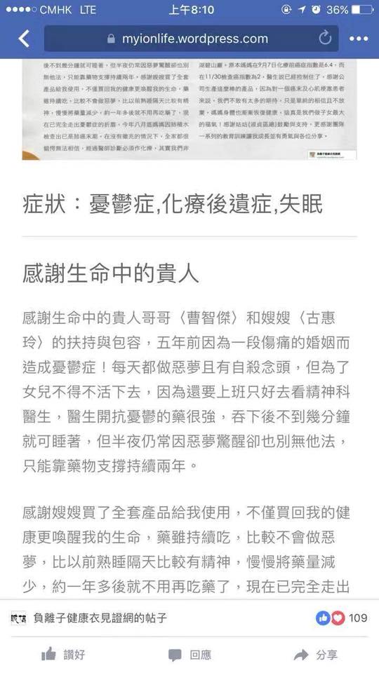 感謝嫂嫂買了全套產品給我使用,不僅買回我的健康更喚醒我的生命,藥雖持續吃,比較不會做惡夢,比以前熟睡隔天比較有精神,慢慢將藥量減少,約一年多後就不用再吃藥了,現在已完全走出憂鬱症的折磨,今年八月底媽媽因肺積水檢查出已是肺癌末期,在沒有徵兆的情況下,全家都很錯愕無法相信,經過醫師診斷必須作化療,其實我們非常擔心,媽媽已