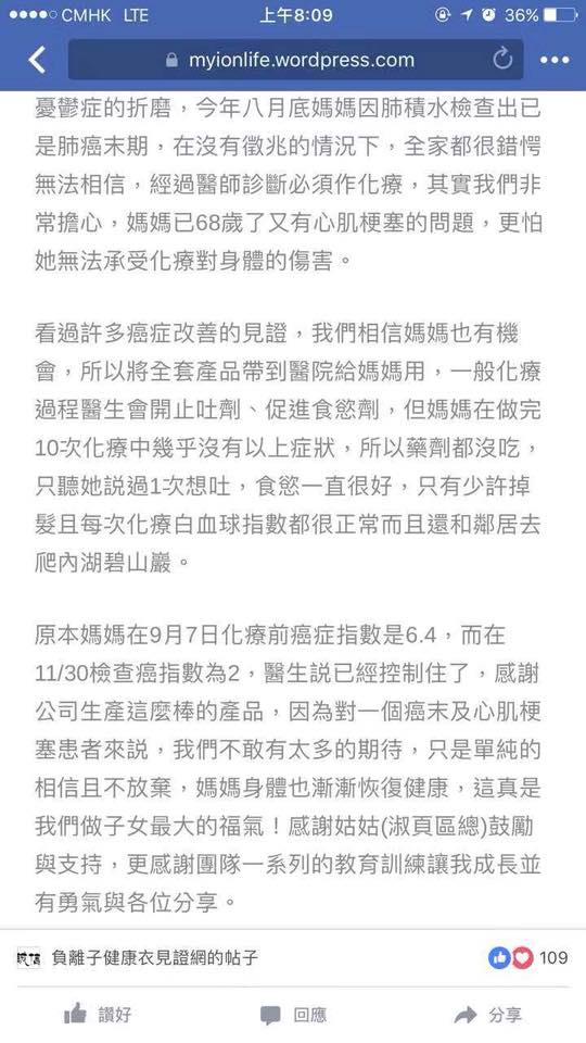 ,醫生説已經控制住了,感謝公司生產這麼棒的產品,因為對一個癌末及心肌梗塞患者來説,我們不敢有太多的期待,只是單純的相信且不放棄,媽媽身體也漸漸恢復健康,這真是我們做子女最大的福氣!感謝姑姑