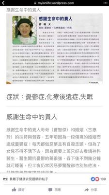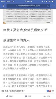 感謝生命中的貴人哥哥〈曹智傑〉和嫂嫂〈古惠玲〉的扶持與包容,五年前因為一段傷痛的婚姻而造成憂鬱症!每天都做惡夢且有自殺念頭,但為了女兒不得不活下去,因為還要上班只好去看精神科醫生,醫生開抗憂鬱的藥很強,吞下後不到幾分鐘就可睡著,但半夜仍常因惡夢驚醒卻也別無他法,只能靠藥物支撐持續兩年。