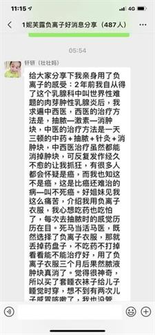 好姐妹见我这么痛苦,介绍我用负离子衣服,我心想吃药也吃怕了,每次去抽脓时的感觉历历在目。死马当活马医,既然选择了负离子衣服,那就丢掉药盘子,不吃药不打掉看看能不能治疗好,用了负离子衣服三个月后果然脓液肿块真消了。