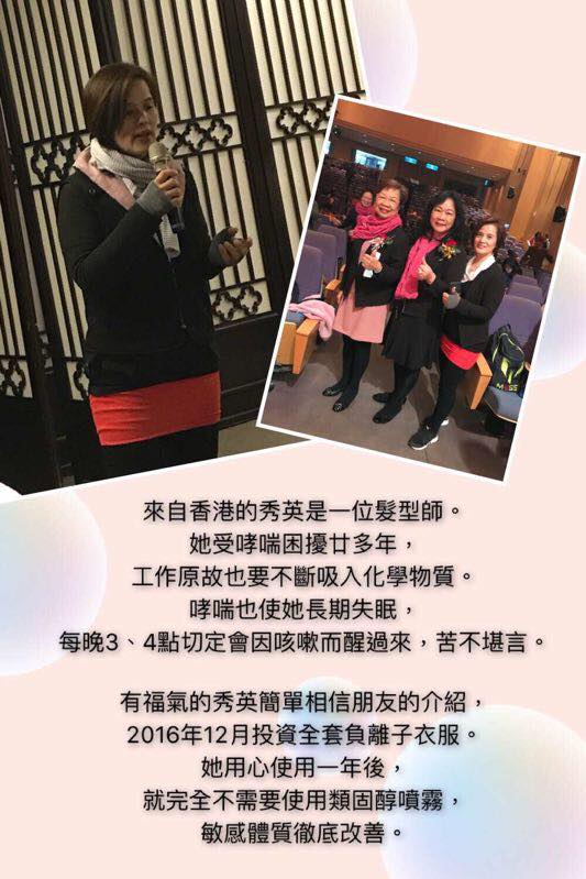 月投資全套負離子衣服。她用心使用一年後,就完全不需要使用類固醇噴霧,敏感體質徹底改善。