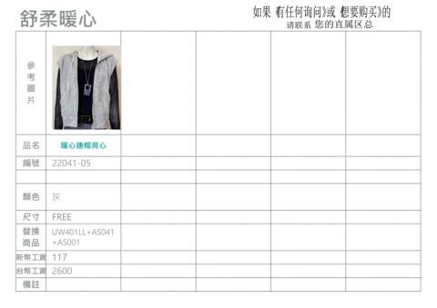 舒柔暖心 ೂݔuႵޅ࿘໙vࠇuམေܓઙv֥ ౨৳༢ ଢ଼֥ᆰඋሹ 參 考 圖 片 品名 暖心連帽背心 編號 22041-05 顏色 灰 尺寸 FREE 替換 UW401LL+AS041 商品 +AS001 新幣工資 117 台幣工資 2600 備註