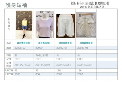 品名 護身休閒短褲 護身百搭短T 護身蕾絲短褲 護身蕾絲短裙 欄1