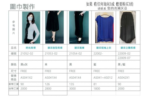 品名 時尚高領 韻采造型⾧裙 韻采寬褲 韻采短袖上衣 韻采立體⾧裙